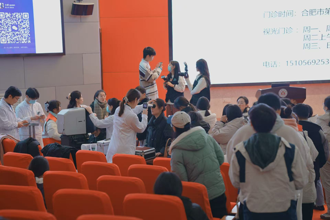 活動中,來自市二院的十余位醫生詳細講解了急救知識,通過實際操作演示讓師生更直觀地理解了心肺復蘇、人工呼吸以及海姆立克急救法等關鍵技能。急診科醫生王敬軍鼓勵學生們積極參與到實操練習中去,以便能夠在關鍵時刻發揮作用。眼科專家王志敏利用生動形象的圖片與案例,向大家介紹了長時間使用電子產品對眼睛可能造成的傷害,并提出了幾點有效預防近視加深的方法建議。活動最后,合肥市第二人民醫院的專業醫療人員還為到場的學生免費提供眼部健康檢查服務。