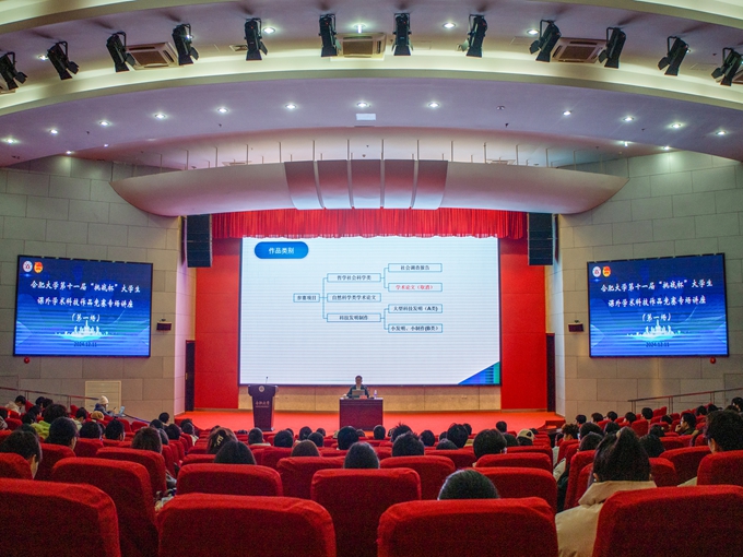 隨后,由安徽誠恩文化科技發展有限公司總經理許飛主講專場講座。許飛細致地從賽事分類、參賽作品申報、評審標準等方面進行介紹,引用“田忌賽馬”深入淺出地說明主體賽與專項賽的重要性,并圍繞往年優秀作品分享自己的見解。他提議參賽者把握“時間早”和“主題正”的選題邏輯,寫好調查報告,強化成果運用。講座最后,師生們積極踴躍提問,許飛一一細致回復和指導。