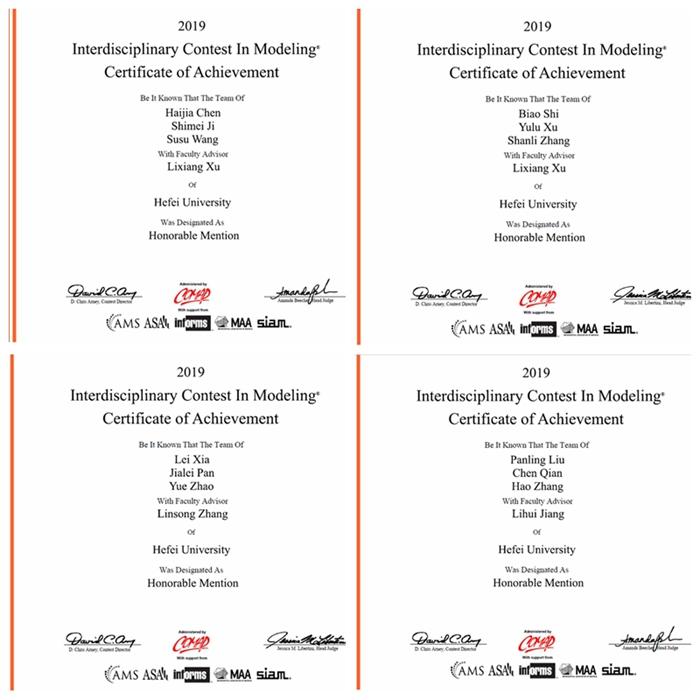 2019年美國大學生數學建模競賽結果日前公布,合肥學院數理系、電子系、機械系學生在徐立祥、張林松、江立輝等教師指導下,榮獲四項H獎(國際二等獎)。