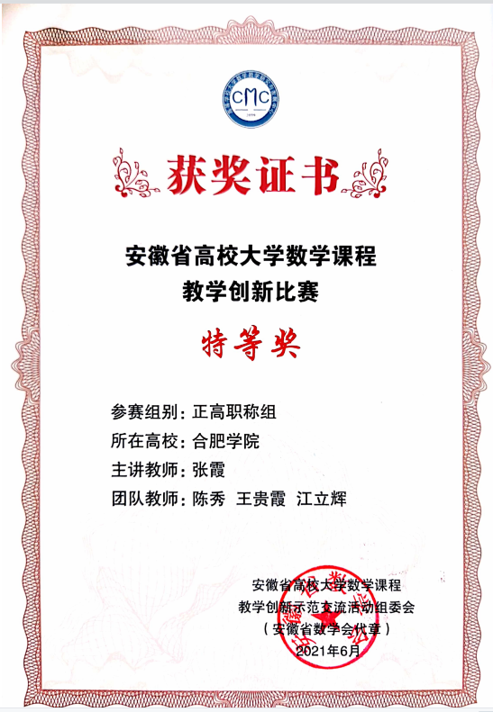 在這個過程中,團隊不斷優化整合課程內容,降低基礎數學課和專業課內容的重復性,將課程內容體系從“以學科為導向”轉變成“以專業為導向”,原本“各自為政”的課程內容在模塊化課程內容體系改革中逐漸走向深度“融合”。源浚者流長,根深者葉茂。2020年,《工程應用數學A》入選首批國家級線下一流本科課程,這也是大學數學教學團隊18年來推進數學教學改革結出的碩果。2021年張霞獲安徽省高校大學數學課程教學創新大賽(正高組)特等獎。
