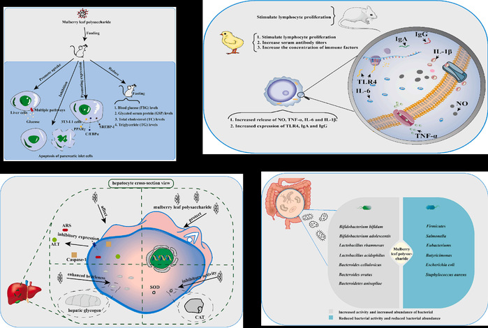 桑葉多糖的降血糖活性、免疫活性、肝細(xì)胞保護(hù)和腸道菌群影響機(jī)制圖