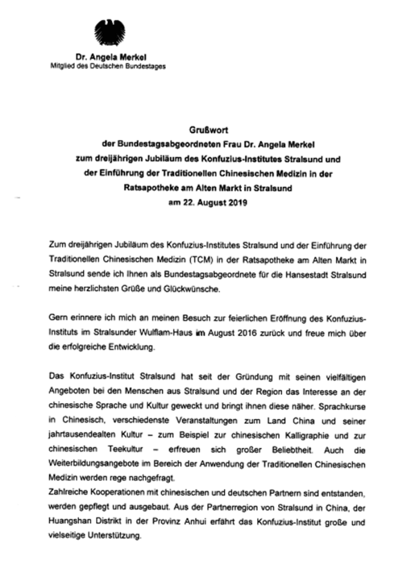 Das Konfuzius-Institut Stralsund feierte vor kurzem sein dreij?hriges Jubil?um. Dazu richtete Bundeskanzlerin Angela Merkel ihr Gru?wort. Sie sagte, dass das Konfuzius-Institut Stralsund seit seiner Er?ffnung viele Sprachkurse und kulturelle Veranstaltungen für die Bewohner vor Ort und in der Umgebung angeboten habe, die sich für die chinesische Kultur und Sprache interessieren würden.