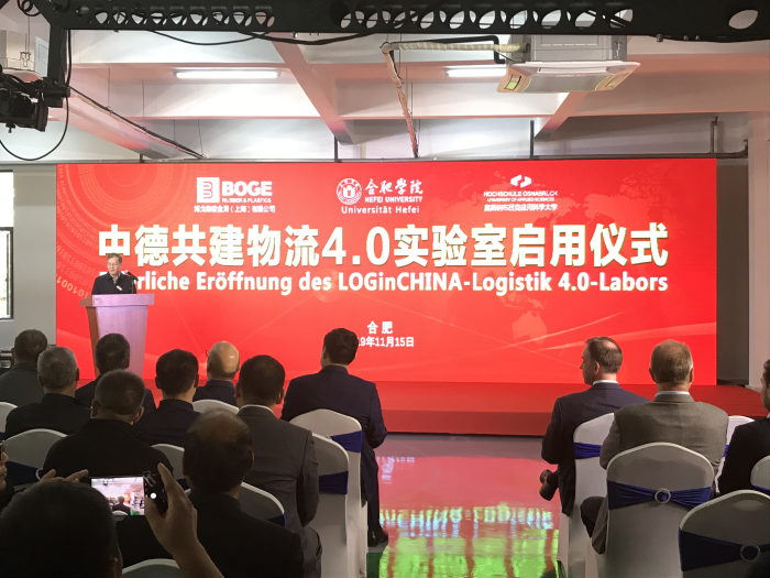 11月15日,中德共建物流4.0實驗室落成暨啟用儀式在我校產學研大樓順利舉行。合肥學院黨委書記、校長王其東出席儀式,德國奧斯納布呂克應用科學大學教授、中德合作物流管理專業項目負責人米歇爾?舒勒,安徽大學黨委書記蔡敬民,海口經濟學院校長陳嘯,中國科學技術大學管理學院丁斌教授,博戈公司總經理福萊穆勒,德國人工智能研究所高級研究員亨利?歌思林博士等70余名專家及企業代表參加。本次儀式由合肥學院經濟與管理學院院長陳江華主持。