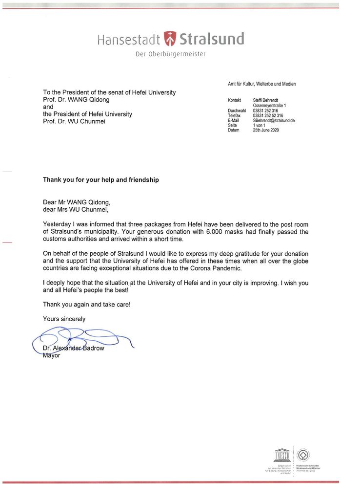 Kürzlich schrieb der Bürgermeister von Stralsund, Herr Dr. Alexander Badrow, im Namen der Stadtregierung und der Bürger an den Parteisekret?r unserer Universit?t, Wang Qidong, und die Pr?sidentin Wu Chunmei, und dankte unserer Universit?t aufrichtig für die Spende von 6000 medizinischen Masken an die Stadt. Er wünschte allen Lehrkr?ften und Studierenden unserer Universit?t und allen Bürgerinnen und Bürgern von Hefei alles Gute.