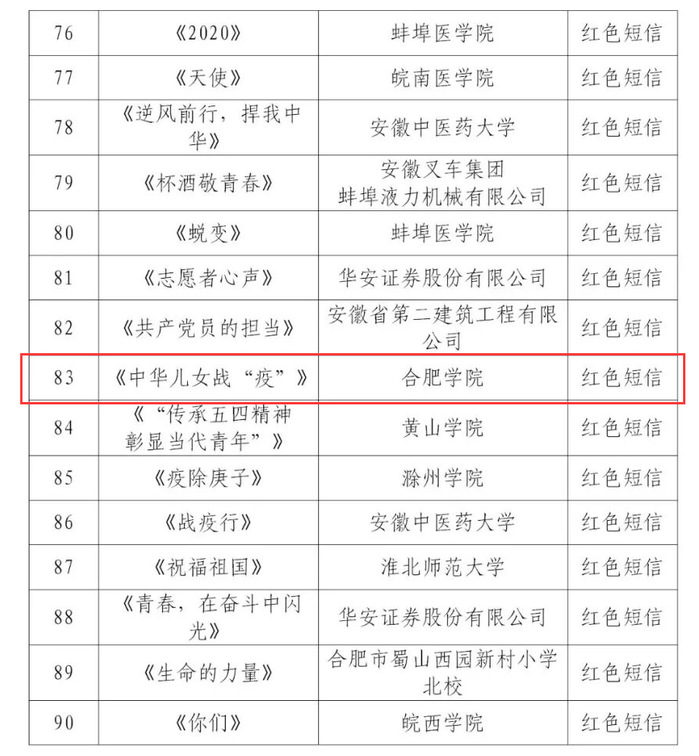 日前,安徽省委組織部、共青團安徽省委、安徽省學生聯合會公布了《安徽省疫情防控和決戰決勝脫貧攻堅紅色信息征集活動獲獎名單》,我校先進制造工程學院學生工作辦公室主任耿俁老師的作品《中華兒女戰“疫”》(詩歌)榮獲二等獎。