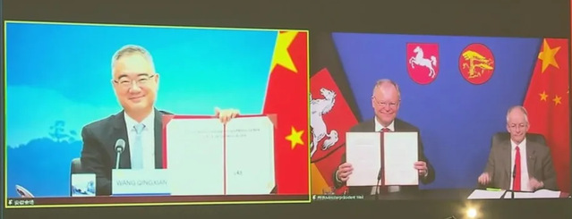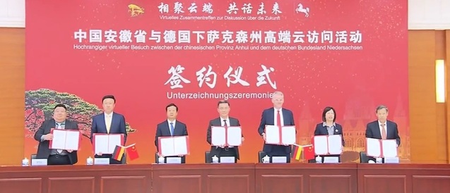 王清憲與魏爾線上簽署了《中華人民共和國安徽省人民政府與德意志聯邦共和國下薩克森州政府關于進一步深化友好省州關系合作意向書》并互贈禮品。