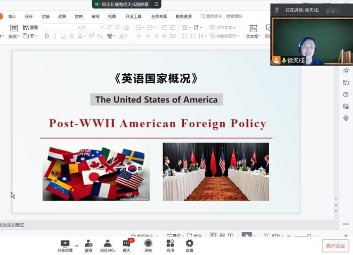 雖然已具備較為豐富的線上教學經驗,但外國語學院的徐天戍老師還是堅持不斷探索更好的教學方式。徐天戍本學期教授《英語國家概況2》和《英語聽說2》兩門課程,雖然線上課堂有局限性,但徐老師靈活并用智慧教學手段,讓課堂“更智慧”。徐天戍每節課都會讓學生用學習通簽到,通過對比學習通簽到名單和會議室在線人數,雙重考勤,及時了解學生到課情況,保障到課率;通過不定時隨機點名、發布主題討論等方式,提高學生專注度;沿用翻轉課堂形式,讓學生完成小組任務、課前十分鐘測試、課后測試、上傳筆記,確保學生“真在學”。