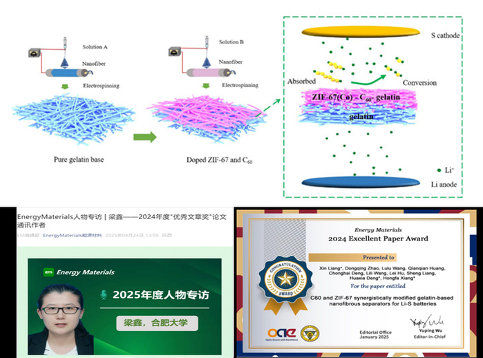 團隊利用靜電紡絲技術,結合C60和ZIF-67協同改性明膠基納米纖維隔膜,有效抑制多硫化物穿梭,提升電池性能。該研究成果以“C60 Open Access and ZIF-67 synergistically modified gelatin-based nanofibrous separators for Li-S batteries”為題,發表在《Energy Materials》上。同時本論文被評選為2024年《Energy Materials》雜志優秀論文。梁鑫為第一作者及通訊作者,合肥大學能源材料與化工學院為第一完成單位。