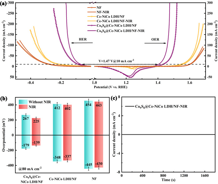 圖8 電極在近紅外激光照射下的性能,(a)LSV極化曲線;(b)80 mA·cm?2下HER和OER的過電位;(c)近紅外光照射下Co9S8@Ce-NiCo LDH電極的無偏壓I-T曲線