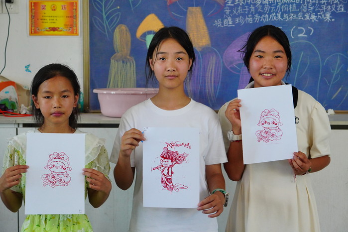 為進(jìn)一步講好中國故事,推廣中華優(yōu)秀傳統(tǒng)文化,志愿者們依托挑戰(zhàn)杯省賽獲獎項目,以“朱砂拓福” 為主題講述年畫的歷史淵源與文化寓意。孩子們親手體驗拓印工藝,感受傳統(tǒng)藝術(shù)的博大精深。朗誦課上,志愿者們以毛澤東詩詞《沁園春·長沙》為主要教學(xué)內(nèi)容,從字詞解析到情感把握展開系統(tǒng)性的指導(dǎo)。繪畫課與手工課上孩子們盡情創(chuàng)作,一幅幅充滿童趣的圖案,一件件獨具匠心的作品,既保留了傳統(tǒng)文化的吉祥寓意,又融入了孩子們的奇思妙想。