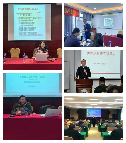 在培訓過程中,浙江省教育廳副總督學、浙江省特級教師繆水娟,華東師范大學教育學部教育學系教授、博士生導師杜成憲,浙江大學繼續教育心理學導師李育新,中國企業情商領導力系統導師張顧嚴,浙江師范大學法政學院教授宋高初分別作了題為《“十四五”基礎教育改革的重點難點》、《中國傳統的管理文化》、《教育智慧——管理心理學與教育管理賦能》、《博弈論與情商領導力》、《我國基礎教育法規及案例分析》的專題報告。
