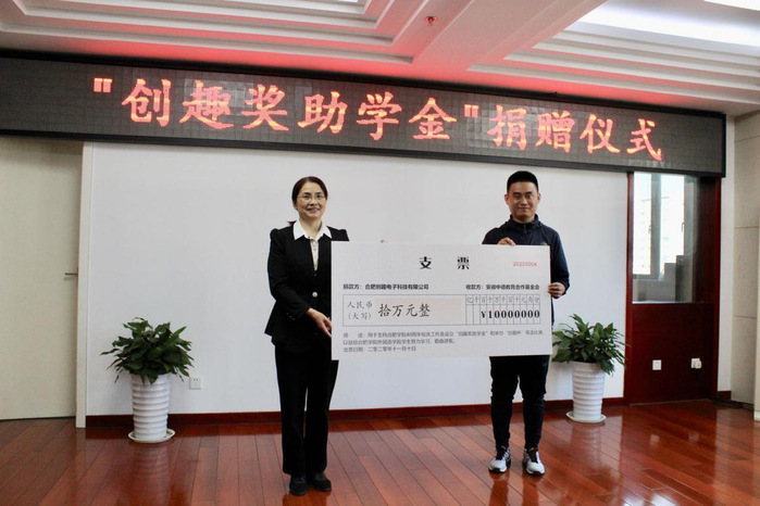 捐贈儀式上,雙方簽訂捐贈協議。方成俊代表合肥創趣電子科技有限公司向基金會遞送捐贈支票。陳秀代表基金會向合肥創趣電子科技有限公司頒發捐贈證書。