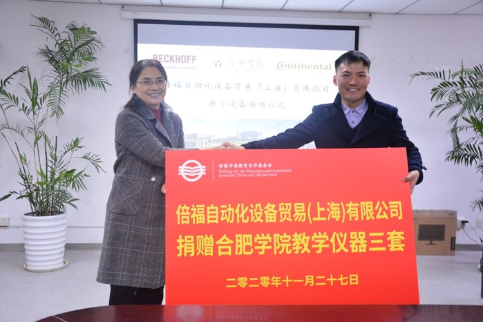 11月27日下午,倍福自動化設備貿易(上海)有限公司教學設備捐贈儀式在我校40棟會議室舉行。副校長、安徽中德教育合作基金會(以下簡稱基金會)理事長陳秀出席捐贈儀式,倍福自動化設備貿易(上海)有限公司代表張洪彪、葛長響,大陸馬牌公司代表汪鑫,校計劃財務處處長、基金會秘書長何世昆以及中德教育合作示范基地(基金)管理辦公室主任劉金平等參加了捐贈儀式。儀式由先進制造工程學院院長呂剛主持。