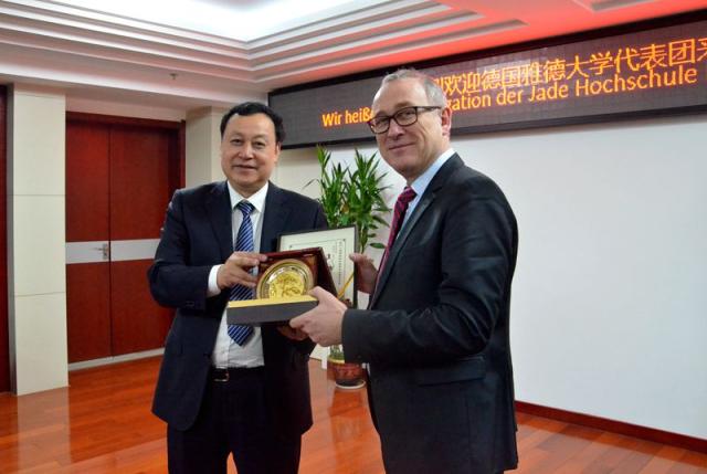Am 10.12. 2016 empfang Prof. Dr. Jingmin Cai, Parteisekret?r der Universit?t Hefei, im Besprechungsraum vom 8. Stock im Verwaltungsgeb?ude Herrn Prof. Dr. Manfred Weisensee, den Pr?sidenten der Jade Hochschule, und Frau Andrea Menn, Leiterin International Office der Jade Hochschule. Beide Seiten führten ein erfolgreiches Gespr?ch über Fortführung der Zusammenarbeit,neueKooperationen, Forschungszusammenarbeit und Programm des BMBF ?Ausbau der Chinakompetenzen“. Nach dem Gespr?ch besichtigten die deutschen G?ste die Ausstellung vom 30j?hrigen chinesisch-deutschen Aufbau der Universit?t Hefei.