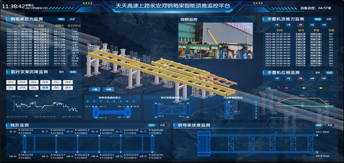 該智能頂推安全監(jiān)控系統(tǒng)平臺(tái)是由合肥大學(xué)完全自主研發(fā)的在線監(jiān)測系統(tǒng),以結(jié)構(gòu)安全和施工過程預(yù)警為導(dǎo)向,深度融合了物聯(lián)網(wǎng)、大數(shù)據(jù)、云/邊緣計(jì)算、人工智能以及數(shù)字孿生等先進(jìn)理念,可廣泛應(yīng)用于橋梁、房屋、隧道、邊坡等結(jié)構(gòu)安全在線監(jiān)測與健康管理。該系統(tǒng)利用云平臺(tái)共享技術(shù),通過預(yù)設(shè)無線傳輸設(shè)備模塊,實(shí)現(xiàn)了監(jiān)測數(shù)據(jù)融合、三維施工模擬、參數(shù)閾值預(yù)警等多項(xiàng)功能。為了應(yīng)對(duì)本次施工安全需求,研究團(tuán)隊(duì)等對(duì)智能監(jiān)控平臺(tái)進(jìn)行了定制化模塊開發(fā),包括鋼箱梁、臨時(shí)支架、鋼導(dǎo)梁、步履機(jī)施工過程參數(shù)及現(xiàn)場視頻信息傳輸?shù)饶K建設(shè)。結(jié)合無線傳輸和實(shí)時(shí)數(shù)據(jù)采集技術(shù),實(shí)現(xiàn)了鋼箱梁頂推過程中主要參數(shù)的實(shí)時(shí)監(jiān)測。經(jīng)過2個(gè)多月的現(xiàn)場實(shí)踐,智能監(jiān)控系統(tǒng)實(shí)時(shí)完整記錄并分析了施工階段各項(xiàng)關(guān)鍵參數(shù),為類似橋梁安全施工提供了可靠的數(shù)字化監(jiān)測平臺(tái)。