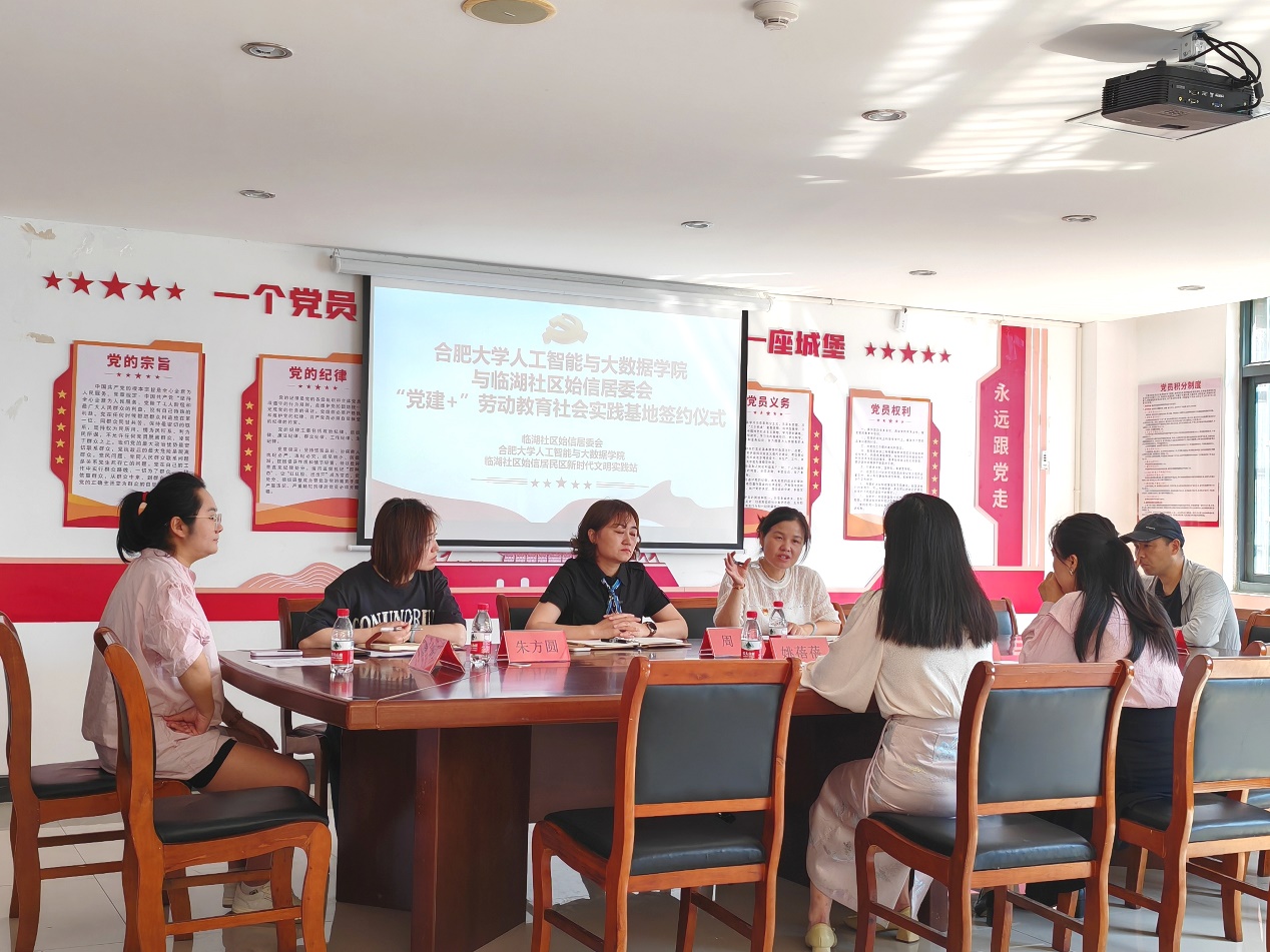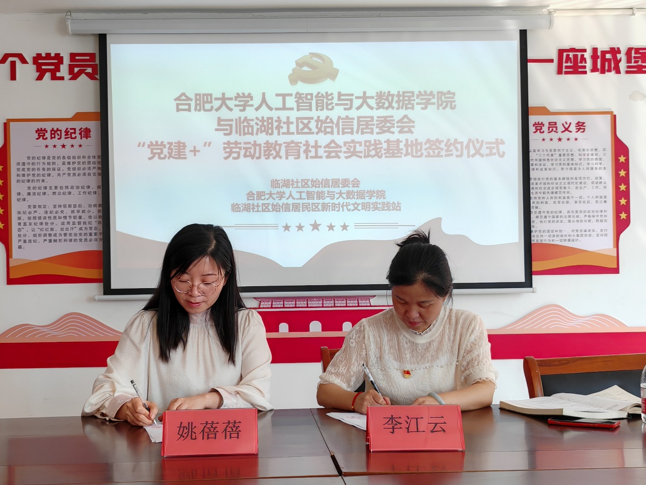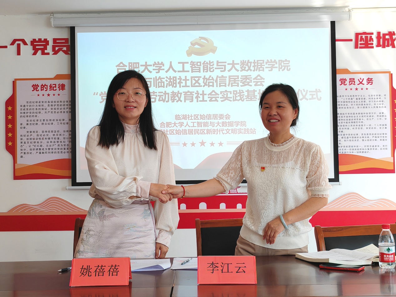 5月29日上午9時,合肥大學人工智能與大數據學院與臨湖社區始信居委會在始信居委會在濱湖前城小區活動中心舉行了“黨建+”勞動教育社會實踐基地簽約授牌儀式。此次活動的舉行標志著雙方在勞動教育方面和社會服務方面邁出了堅實的步伐,為學生提供了實踐平臺的同時,也加強了學院與社區的聯系。