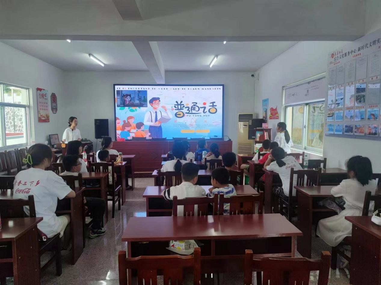 為豐富社區(qū)兒童暑期生活,團隊成員去往多個社區(qū),搭建“七彩課堂”教育平臺。7月17日下午,來蘇社區(qū)內,科普組的同學發(fā)揮師范類專業(yè)的優(yōu)勢,開展推廣普通話的公益課堂。同學們通過互動式教學和有趣的語言游戲,讓小朋友們在輕松愉悅的氛圍中學習普通話的重要性。