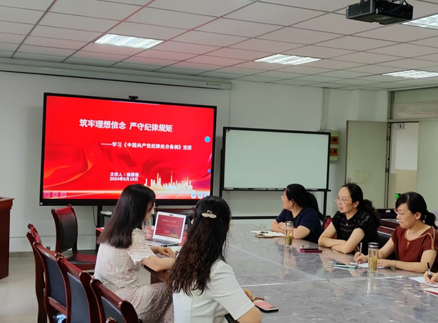 2024年6月18日下午,人工智能與大數據學院教工第三黨支部在37棟305會議室開展了“筑牢理想信念 嚴守紀律規矩” 黨紀學習教育主題黨課,由人工智能與大數據學院黨委委員、副書記姚蓓蓓同志為全體黨員講授。本次主題教育專題黨課活動由支部書記管梅主持,支部全體黨員參加了活動。