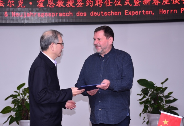 Am Morgen des 10. Februar fand an der Universit?t Hefei im Konferenzraum im 9. Stock des Verwaltungsgeb?udes eine Ernennungsfeier für ausl?ndische Professoren und ein Neujahrssymposium statt, bei dem Falk H?hn von der Hochschule Hannover in Deutschland als ausl?ndischer Professor eingestellt wurde. An der Zeremonie nahmen der Parteisekret?r Wang Qi Dong und die Pr?sidentin der Universit?t Hefei Wu Chunmei teil. Die Verantwortlichen des Organisationbüros, des Büros für akademische Angelegenheiten, des Personalbüros, des Büros für internationalen Austausch und Zusammenarbeit, des Büros für Masterstudierenden, der Fakult?t für Design sowie der Fremdsprachenfakult?t nahmen auch an der Zeremonie teil. Herr Wang Qidong stellte Professor H?hn ein Ernennungsschreiben aus, Frau Ji Ping, Direktorin der Personalabteilung unterzeichnete im Namen der Universit?t eine Ernennungsvereinbarung mit Professor H?hn.