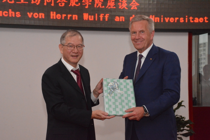 Bei der Besprechung dankte Wang Qidong Herrn Wulff herzlich für seinen Beitrag zur langfristigen Unterstützung der Entwicklung der Universit?t Hefei und gab einen überblick über die Fortschritte bei der kontinuierlichen Vertiefung der Zusammenarbeit mit Deutschland in den letzten vier Jahren seit dem fünften Besuch von Herrn Wulff im Jahr 2019. Die Universit?t Hefei hat nacheinander Kooperationsvereinbarungen mit der Hochschule Osnabrück und DHIK geschlossen. Gemeinsam mit anderen chinesischen und deutschen Universit?ten hat die Universit?t Hefei die chinesisch-deutsche Plattform für offenes Online-Lernen aufgebaut, gemeinsam auch mit dem Volkswagen Konzern das Volkswagen-Institut gegründet und mehrfach das chinesisch-deutsche Symposium für anwendungsorientierte Hochschulbildung ausgerichtet, was eine wichtige Rolle als Modell und Vorreiter bei der Erkundung des Weges der chinesisch-deutschen Zusammenarbeit im Bildungsbereich gespielt hat.