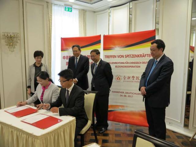 Am Vormittag des 14.06. fand ein Treffen von Spitzenkr?ften der Modelleinrichtung der Bildungskooperation zwischen China und Deutschland in Hannover statt. Prof. Dr. Cai Jinmin, Parteisekret?r der Universit?t Hefei, hielt dabei eine Rede. Dr. Li Jinbin rechnete in seiner nachfolgenden Rede der Universit?t Hefei hoch an, dass sie als Brücke bei der F?rderung der chinesisch-deutschen Bildungskooperation eine wichtige Rolle spiele. Er zitierte Ministerpr?sident Li Keqiang und teilte seine Hoffnung, dass die Kooperationen der Universit?t Hefei auch in Zukunft, so w?rtlich ?wie ein starker Baum mit tiefen Wurzeln“ sein m?gen.
