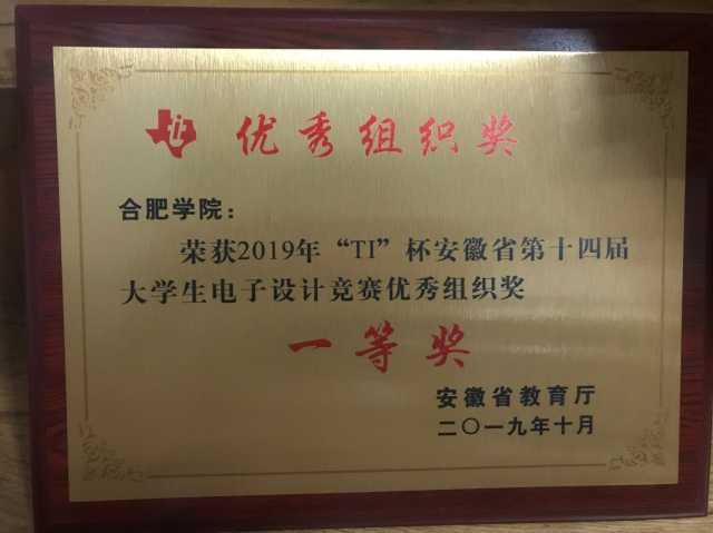 合肥學(xué)院榮獲2019年“TI”杯安徽省第十四屆大學(xué)生電子設(shè)計(jì)競(jìng)賽優(yōu)秀組織獎(jiǎng)一等獎(jiǎng),參賽學(xué)生榮獲安徽省一等獎(jiǎng)4項(xiàng),二等獎(jiǎng)1項(xiàng),三等獎(jiǎng)5項(xiàng)。(先進(jìn)制造工程學(xué)院李翠花)