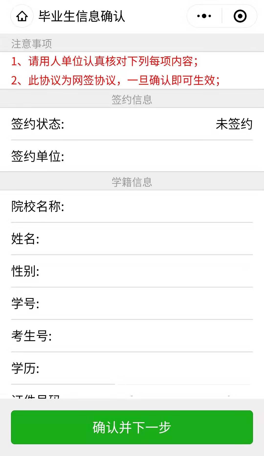 第二步、用人單位打開微信,使用掃一掃功能,掃碼后,會出現填寫簽約信息頁面;用人單位首先驗證畢業生信息,確認下一步后,填寫本單位基本信息和聯系方式,并選擇簽約畢業生的工作崗位,然后點擊“確認簽約”后提交。