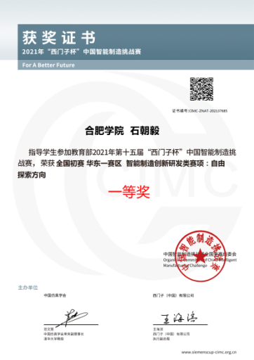 2021年7月20日,教育部第十五屆CIMC “西門子杯”中國(guó)智能制造挑戰(zhàn)賽全國(guó)初賽順利舉辦,通過線上線下兩種形勢(shì)同期進(jìn)行,于24日圓滿落下帷幕。本屆比賽有來自全國(guó)近700所高校中的6000支參賽隊(duì)伍,累計(jì)1萬(wàn)余名師生。經(jīng)過專家網(wǎng)上評(píng)審及線下評(píng)測(cè),最終電子信息工程系有4支隊(duì)伍突出重圍。共獲得全國(guó)初賽 華東一賽區(qū)一等獎(jiǎng)2項(xiàng),二等獎(jiǎng)1項(xiàng),三等獎(jiǎng)1項(xiàng)。沈鳳嬌和張勝老師指導(dǎo)的18級(jí)電子信息工程學(xué)生童子文、吳艷、17級(jí)電子信息學(xué)生丁義組成“油刃有魚”隊(duì)獲得自由探索方向全國(guó)初賽 華東一賽區(qū)一等獎(jiǎng);電子信息工程專業(yè)18級(jí)學(xué)生劉文佳、19級(jí)楊成曉、17級(jí)房晴晴組成的“科技先驅(qū)小隊(duì)”隊(duì)獲得自由探索方向全國(guó)初賽 華東一賽區(qū)二等獎(jiǎng);沈鳳嬌和石朝毅老師指導(dǎo)的18級(jí)電子信息學(xué)生徐梓強(qiáng)、18級(jí)自動(dòng)化學(xué)生趙慧杰和付紫平組成的“Fly”隊(duì)獲得自由探索方向全國(guó)初賽 華東一賽區(qū)一等獎(jiǎng)。沈鳳嬌和張勝老師指導(dǎo)的電子信息工程18級(jí)徐秋洋、19級(jí)朱家樂,自動(dòng)化18級(jí)學(xué)生楊深慧組成的“跡行”隊(duì)獲智能產(chǎn)線與協(xié)作機(jī)器人方向全國(guó)初賽華東一賽區(qū)三等獎(jiǎng)。