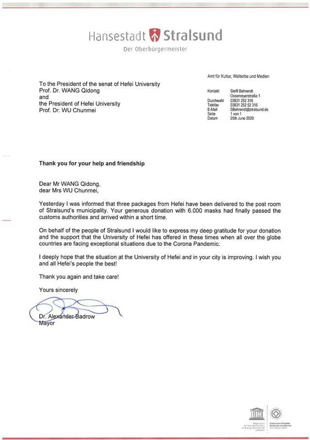 On behalf of the municipal government, Alexander Badrow, Mayor of Stralsund, expresses his heartfelt thanks in his letter to Dr. Wang Qidong, Chair of HFU Council and Dr. Wu Chunmei, HFU President, for HFUs donation of 6000 medical masks.