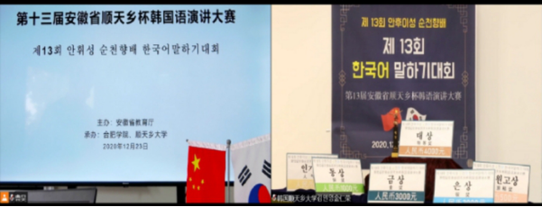 Through online speeches, 30 participants from nearly 20 colleges and universities in Anhui Province take part in the preliminaries and 15 teams advance to the finals. Their speeches center on Korean language, Korean culture and China-Korea exchange. Finally, Jin Xuelian from Anhui University of Technology wins the Grand Prize and Xu Qianhui from Anhui Science and Technology University wins the Gold Medal.