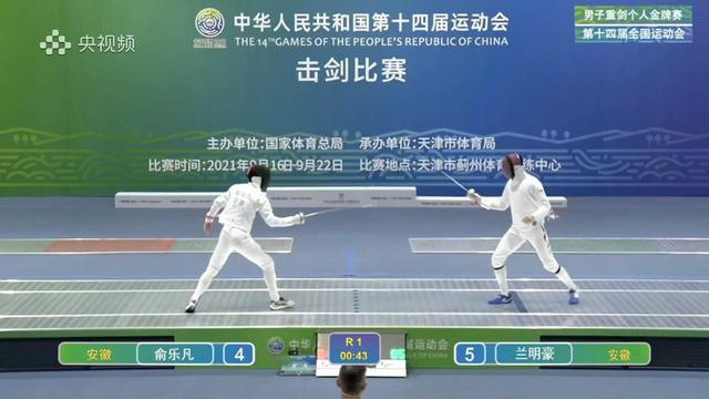 In Tianjin Jizhou Sports Training Center, Lan Minghao, a HFU student majoring in International Trade and Economics, beats his teammate 15-11 to win the Championship of Men’s Epee Individual at the 14th National Games held on the night of September 21.