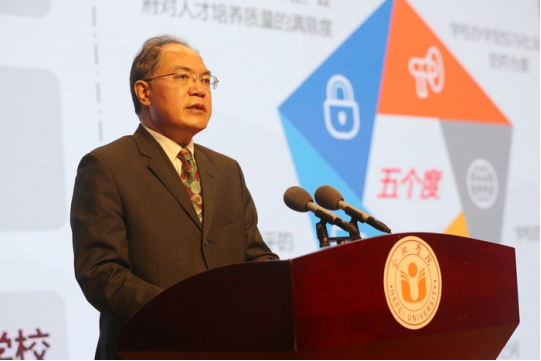 Professor Wu Chunmei, HFU President, gives a speech on “Specialty, Employment and Industry: A Trinity Talents Training Mode of Hefei University”, which establishes a dynamic adjustment mechanism of specialty to cultivate talents with innovation and international vision.