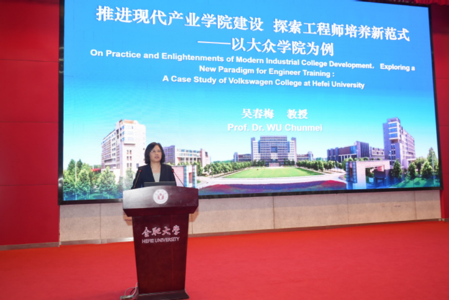 Wu Chunmei, ehemalige Pr?sidentin der Universit?t Hefei und stellvertretende Vorsitzende des Politischen Konsultativkomitees der Stadt Hefei, hielt einen Vortrag mit dem Titel ?On Practice and Enlightenments of Modern Industrial College Development, Exploring a New Paradigm for Engineer Training: A Case Study of Volkswagen College at Hefei University“.