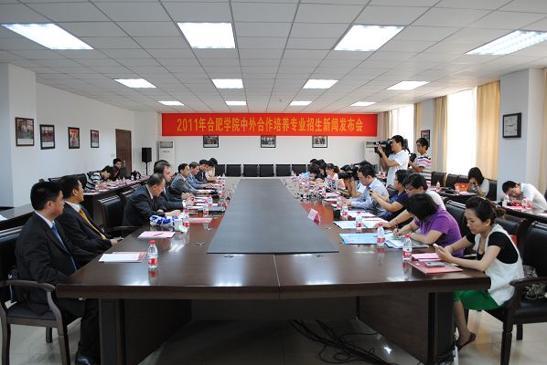 6月27日上午,2011年合肥學院中外合作培養專業招生新聞發布會在我院南艷湖校區厚德大廈會議室順利召開。合肥學院院長蔡敬民,副院長陳嘯,合肥學院客座教授、奧斯納布呂克應用科技大學教授舒勒,合肥學院客座教授、漢諾威應用科技大學教授霍恩,教務處處長、院招辦主任邵一江等相關部門負責人出席了此次新聞發布會。人民網、新華社安徽分社、中國教育報、光明日報、中國青年報、安徽日報、安徽電視臺、安徽教育網、新安晚報、江淮晨報等24家中央及省市媒體親臨新聞發布會現場。發布會由陳嘯主持。