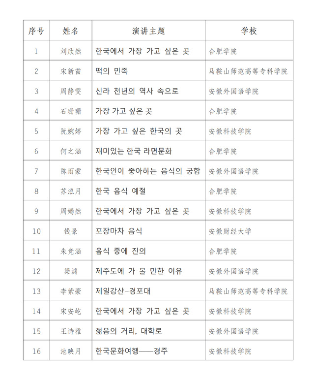 3. 請所有參賽選手填寫第十六屆安徽省順天鄉杯韓國語演講大賽參賽回執(附件1)及參賽選手獎金發放明細表(附件2),并于11月17日(周五)12:00前將表格發送至[email protected];