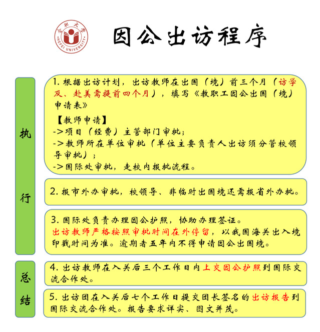 簡而言之,需要報銷的出國(境)是因公出國(境),除國家單獨規定外(孔子學院外派教師等),因公出國(境)須持因公出國(境)證件、遵守國家和《合肥學院出國(境)管理規定》的規定。