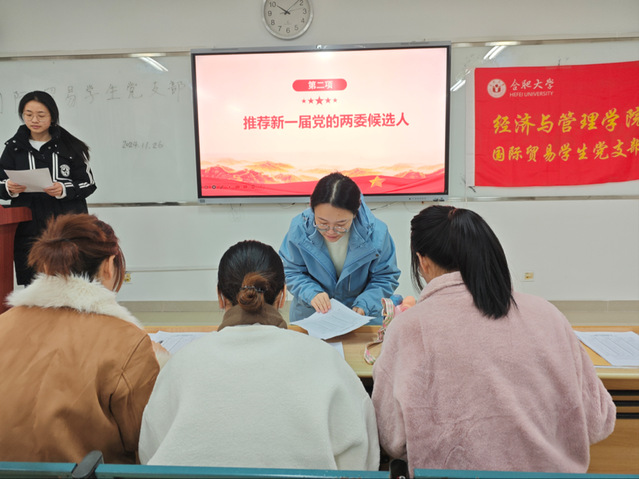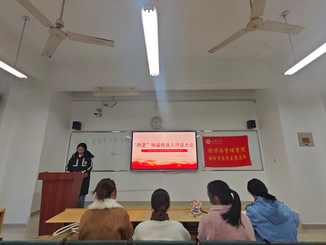 11月26日,經濟與管理學院國際貿易學生黨支部順利召開黨員大會。本次會議旨在傳達學習學校有關文件精神,并推薦學院新一屆黨的委員會和紀律檢查委員會委員候選人。