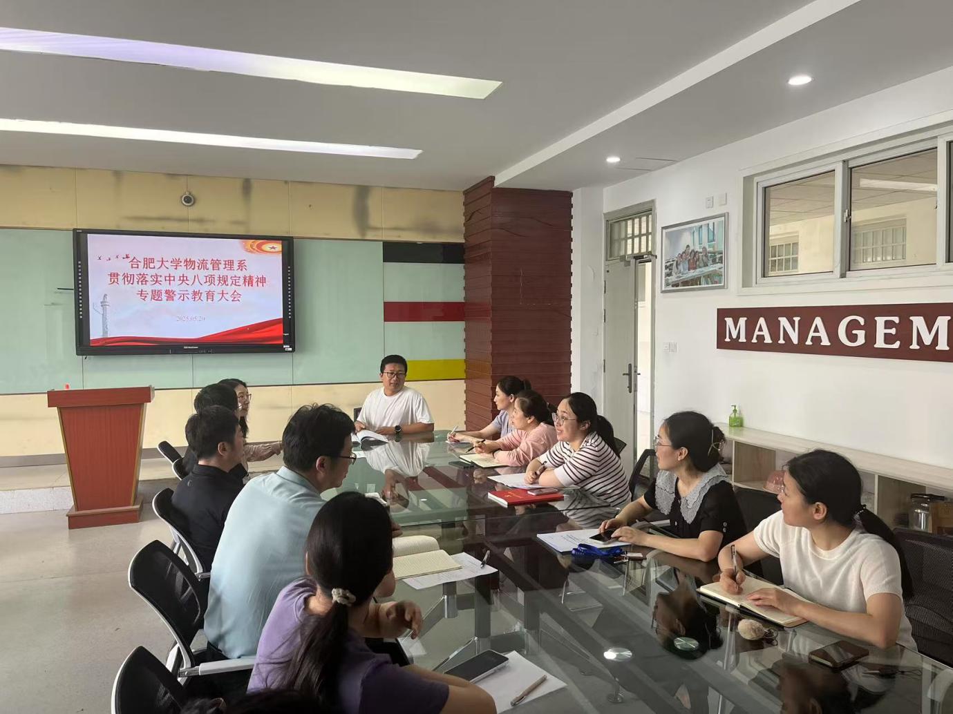 會上,胡中峰首先傳達了《合肥大學深入貫徹中央八項規定精神學習教育工作方案》、《合肥大學經濟與管理學院深入貫徹中央八項規定精神學習教育工作方案》精神,結合《違反中央八項規定及其實施細則精神典型案例》,開展以案說德、以案說紀、以案說法、以案說責,并結合系部工作實際剖析反面典型案例,強調全系教師必須以案為鏡、反躬自省,切實將中央八項規定精神轉化為思想自覺和行動自覺,持續鞏固深化學習教育成果,將中央八項規定作為長期有效的鐵規矩、硬杠杠,推動作風建設常態化長效化,為物流管理系各專業高質量發展提供堅強紀律保障。