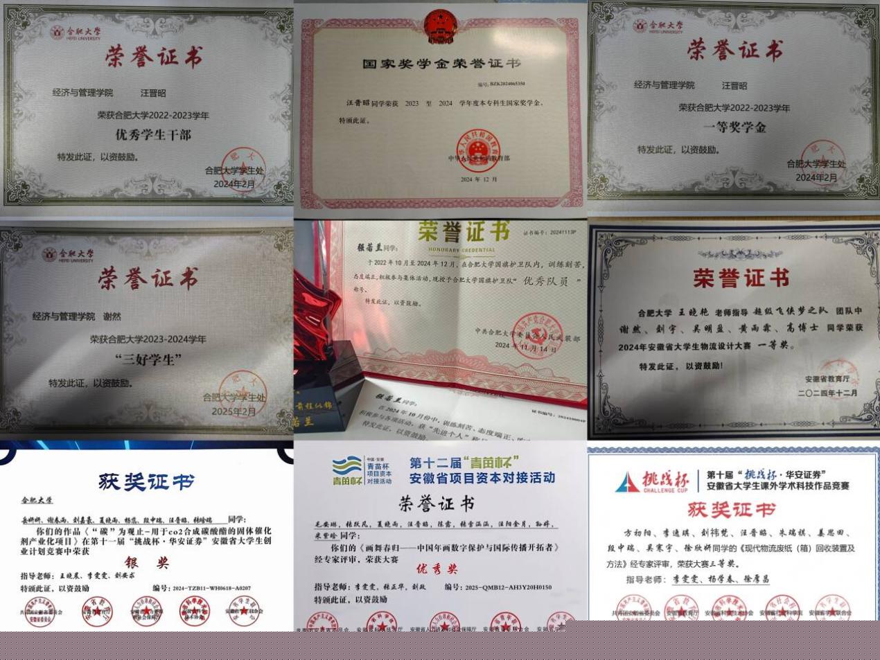 學(xué)習(xí)上,她們勤勉篤學(xué),銳意進(jìn)取。寢室長汪晉昭同學(xué)擔(dān)任班長、輔導(dǎo)員助理,連續(xù)兩年綜合測評位列班級第一,獲國家獎(jiǎng)學(xué)金、校級一等獎(jiǎng)學(xué)金,更以“優(yōu)秀學(xué)生干部”“三好學(xué)生”“優(yōu)秀團(tuán)員”等稱號印證全面發(fā)展之路,她積極參加學(xué)科競賽并獲得省獎(jiǎng)十余項(xiàng)、校獎(jiǎng)二十余項(xiàng),學(xué)習(xí)上認(rèn)真刻苦,思想上積極向上,工作上嚴(yán)謹(jǐn)負(fù)責(zé)。謝然同學(xué)在班級擔(dān)任學(xué)習(xí)委員,曾任南艷青年新媒體中心主編,在學(xué)科競賽中斬獲安徽省物流設(shè)計(jì)大賽一等獎(jiǎng),獲校二等獎(jiǎng)學(xué)金、三好學(xué)生、優(yōu)秀團(tuán)員等榮譽(yù)稱號,秉持著謙遜的態(tài)度,通過不懈的努力不斷進(jìn)步。強(qiáng)若蘭同學(xué)作為班級生活委員,秉持著高度的責(zé)任心,細(xì)致入微地處理班級各項(xiàng)事務(wù)。在學(xué)校國旗護(hù)衛(wèi)隊(duì)中,她憑借日復(fù)一日刻苦訓(xùn)練磨礪出的過硬素質(zhì),從眾多隊(duì)員中脫穎而出,擔(dān)任副班長一職。訓(xùn)練時(shí),不僅嚴(yán)于律己,更主動幫助新隊(duì)員糾正動作、講解要領(lǐng),以專業(yè)的指導(dǎo)和耐心的態(tài)度贏得隊(duì)員一致認(rèn)可,獲評“優(yōu)秀教員”稱號。此外,她在各項(xiàng)任務(wù)中始終沖鋒在前,以出色表現(xiàn)榮獲“優(yōu)秀個(gè)人”表彰,成為校園里踐行愛國精神與責(zé)任擔(dān)當(dāng)?shù)陌駱印?/p>