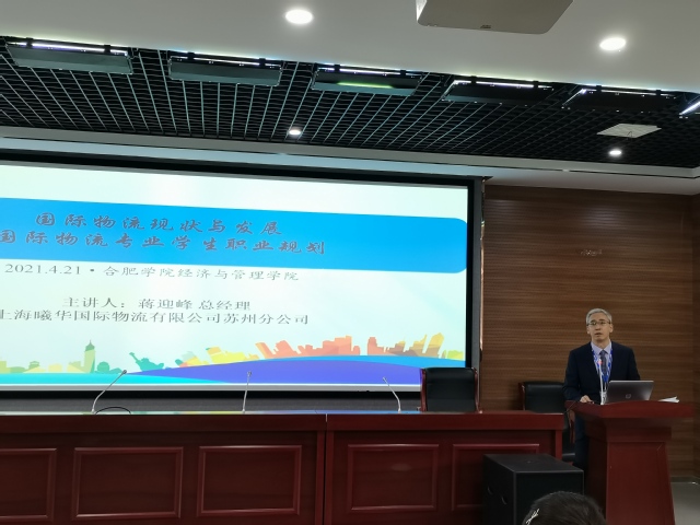 4月21日下午,《國際物流發展及國際物流人才職業規劃》講座在一期6幢一樓學術報告廳舉行。上海曦華國際物流有限公司蘇州分公司蔣迎峰總經理受邀擔任主講人,我院副院長吳悅做開場致辭,上海曦華國際物流有限公司合肥分公司部分負責人、我院物流系部分老師和學生參會。