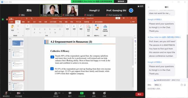 25日下午的會議共有三個分論壇,經管學院承辦的分論壇B在一期6號樓學術報告廳通過直播和線下方式同步進行,由吳悅副院長主持。經管學院副教授趙西博士線上主持了分論壇C,并作了題為平臺經濟中女性賦權”的發言。