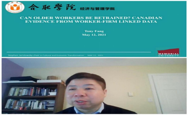 5月12日上午我院特聘教授紐芬蘭紀(jì)念大學(xué)方濤應(yīng)我院教師舉辦了一場主題老年員工可以再培訓(xùn)嗎?來自員工——企業(yè)連接數(shù)據(jù)的證據(jù)的學(xué)術(shù)講座,講座以騰訊會(huì)議的方式進(jìn)行,經(jīng)濟(jì)與管理學(xué)院40余名教師在線聆聽了講座,副院長吳悅主持講座。
