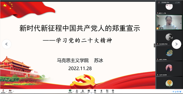 為把學習好、貫徹好、落實好黨的二十大精神作為重要政治任務,積極開展經(jīng)濟與管理學院黨員發(fā)展工作,2022年11月28日,經(jīng)濟與管理學院第七期入黨積極分子線上培訓班第二課《新時代新征程中國共產(chǎn)黨人的鄭重宣示——學習黨的二十大精神》順利開講。本次黨課由馬克思主義學院副院長(主持工作)蘇冰老師主講。