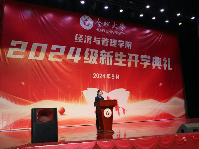 典禮開始前,由啦啦操隊和和舞蹈隊帶來的節目表演拉開典禮序幕,伴隨著莊嚴肅重的國歌,典禮正式開始。24級本科生新生代表陳李潔、24級研究生新生代表徐舒欣分別對未來的校園生活進行了暢想,經管學院學生會主席張毅就大學的學習生活經驗做了分享。隨后,財會系主任鄭姍姍老師對新同學的到來表示熱烈歡迎,鼓勵他們在大學階段奮發向上,最后經管學院院長陳江華為24級新同學帶來開學第一課,勉勵新同學保持積極向上的人生態度,不斷磨練,勇于創新,現場氣氛熱烈。