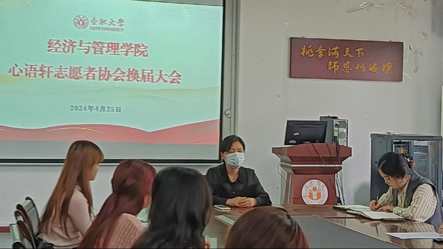 2024年4月25日經濟與管理學院心語軒志愿者協會換大會于六棟223會議室順利召開。會議由經管學院二級心理工作站負責人白杉主持,經管學院黨委副書記夏丹青出席會議,經管學院心語軒志愿者協會全體會員參加會議。