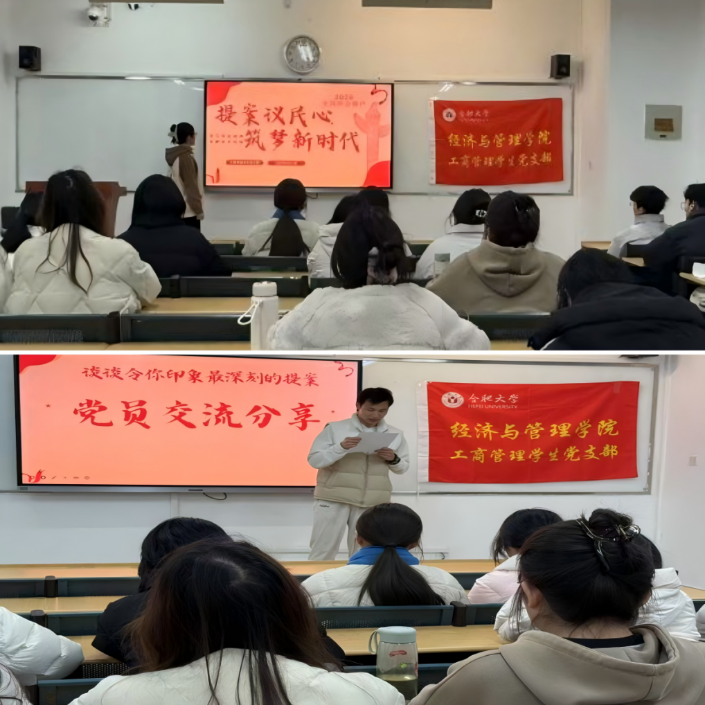 為深入學習貫徹全國兩會精神、激勵青年學子擔當時代使命,3月14日下午,經濟與管理學院工商管理學生黨支部于4棟106教室開展了“提案議民心,筑夢新時代”主題黨日活動。 首先由學生黨員鄭曉微向大家介紹2025年全國兩會召開的背景和主要議題。隨后,學生黨員依次上臺,結合自身專業和興趣,分享其在關注兩會過程中印象深刻的提案,從教育改革到科技創新,從鄉村振興到民生消費,每一個提案都引起在場黨員的深入思考和積極討論。大家表示,要將兩會精神融入日常學習和生活中,以實際行動踐行初心使命。