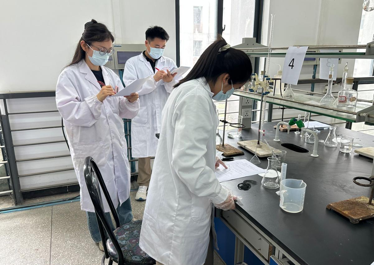 決賽為綜合實(shí)踐操作,實(shí)驗(yàn)環(huán)節(jié)從無(wú)機(jī)化學(xué)、分析化學(xué)、有機(jī)化學(xué)方面著重考察操作實(shí)驗(yàn)儀器、實(shí)驗(yàn)環(huán)節(jié)設(shè)計(jì)、實(shí)驗(yàn)數(shù)據(jù)記錄與處理等能力。比賽過(guò)程中,參賽選手們獨(dú)立思考,沉著冷靜,認(rèn)真進(jìn)行實(shí)驗(yàn)操作,展現(xiàn)了積極向上的良好風(fēng)貌,評(píng)委老師在一旁認(rèn)真觀察選手們的操作,保障實(shí)驗(yàn)的安全性與正確性。大家按照實(shí)驗(yàn)步驟有條不紊地進(jìn)行著,稱重、溶解、攪拌、定容,每一步都彰顯著選手們的實(shí)驗(yàn)操作功底與實(shí)驗(yàn)環(huán)節(jié)的熟悉,舉手投足間展現(xiàn)著他們的細(xì)致入微與嚴(yán)謹(jǐn)認(rèn)真。
