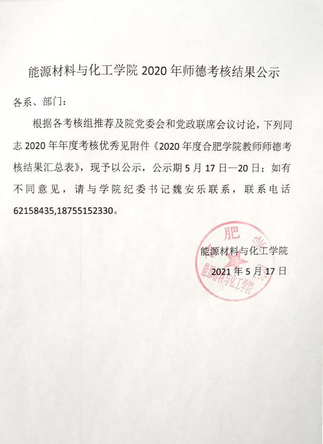 能源材料與化工學院2020年師德考核結果公示