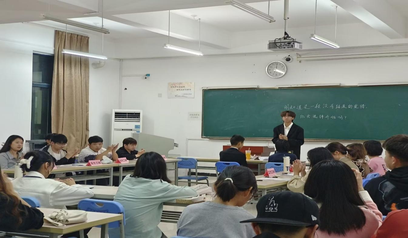 雙方就“明知道是一段沒有結果的愛情,你會選擇開始嗎?”這一辯題開始辯論。比賽開始,雙方互相問好。正方臺詞式的自我介紹給我們留下了深刻的印象。緊接著正方一辯做立論陳詞,正方觀點為“選擇開始這段感情”,他的陳述簡潔且堅定己方觀點。緊接著,反方發表他們的立論陳詞。一瞬間雙方摩擦出了濃濃的火藥味,來到第二回合進行一對一攻辯,正方選手舉出泰坦尼克號的例子,在資產階級的壓迫下,他們肯定沒有好的結果,但是他們還是開始了他們的愛情。并且愛情最后還拯救了rose,讓她活成了真正的自己。反方選手也不甘示弱。反駁道,這個愛情到最后rose到底是幸福多還是痛苦多呢?幾個回合下來,雙方打的有來有回,比賽現場更是令人激動。觀眾們不自覺地發出陣陣掌聲。在最后的嘉賓提問環節里,無論是評委提出的問題還是現場觀眾提出的問題,我們的選手總能給出滿意的答案。在評委們的仔細斟酌下,反方獲得本場比賽的勝利,晉級決賽,最佳辯手為反方二辯。