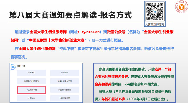 會上,高喬楠老師首先對大賽做了簡要的介紹,強調“互聯網+”大學生創新創業大賽對提高人才培養質量、提升大學生就業創業水平有著重要意義,中央高度重視。同時鼓勵同學們要“敢想會創”,做好準備,積極投身到比賽中去。隨后秦蕊老師帶領大家學習大賽的賽事規則和要求。她詳細分析了2023年“互聯網+”大賽的新變化,幫助同學們充分了解本屆大賽的特點,動員大家積極參與,踴躍報名。